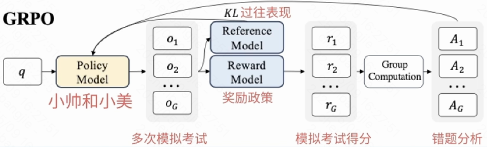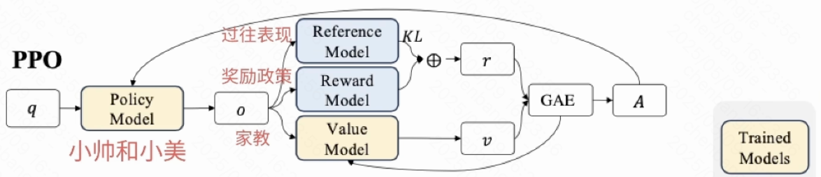它们的协作流程大致是:策略模型做出动作,价值模型评估长期价值并提供“优势函数”信号,指示动作相对于平均水平的优劣。策略模型根据这个信号和参考模型的约束(通过KL散度或概率比裁剪)进行更新,在追求更高回报的同时不被坏“基准”太远。三者协作,确保策略模型在稳步提升的同时不走偏。