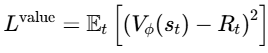 Vϕ(st)是价值网络输出(状态价值预测),Rt是通过经验采样得到的实际折扣累积回报