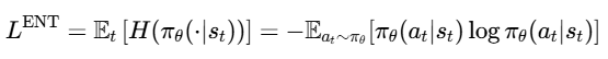 策略的熵H(πθ)是度量其随机性或不确定性的指标。一个均匀的随机策略具有高熵,而确定性策略(总是选择某个特定动作)的熵为零。通过最大化策略的熵,可以鼓励智能体尝试更多不同的动作,避免在训练早期就陷入局部最优,只利用当前看似最好的动作