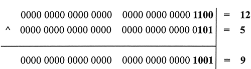 下图以算式的形式解析了 12 和 5 进行位异或运算的过程。通过位异或运算,第 1、4 位的值为 true,而第 2、3 位的值为 false。