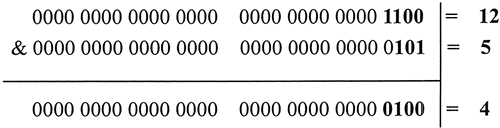 下图以算式的形式解析了 12 和 5 进行位与运算的过程。通过位与运算,只有第 3 位的值为全为 true,故返回 true,其他位均返回 false。
