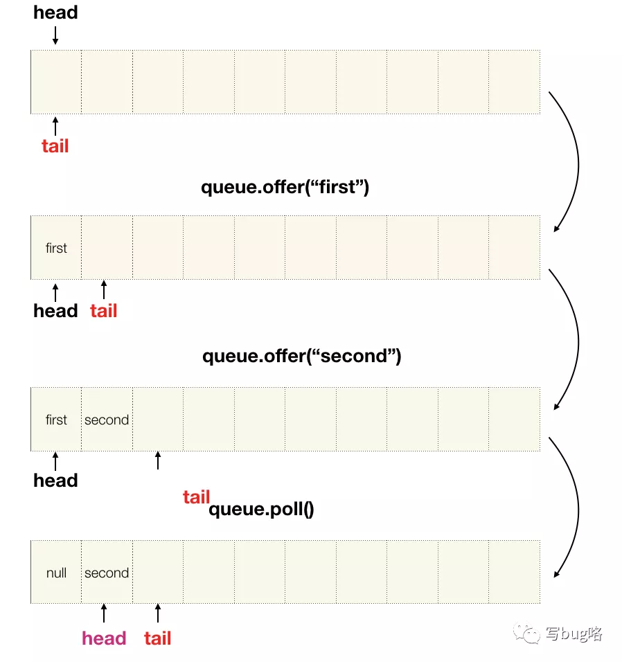 如图示:当调用offer往队里面添加一个元素的时候,是tail指针移动,且tail移动的方向是从前往后(head这个时候是指向队首),即addLast里面的关键: