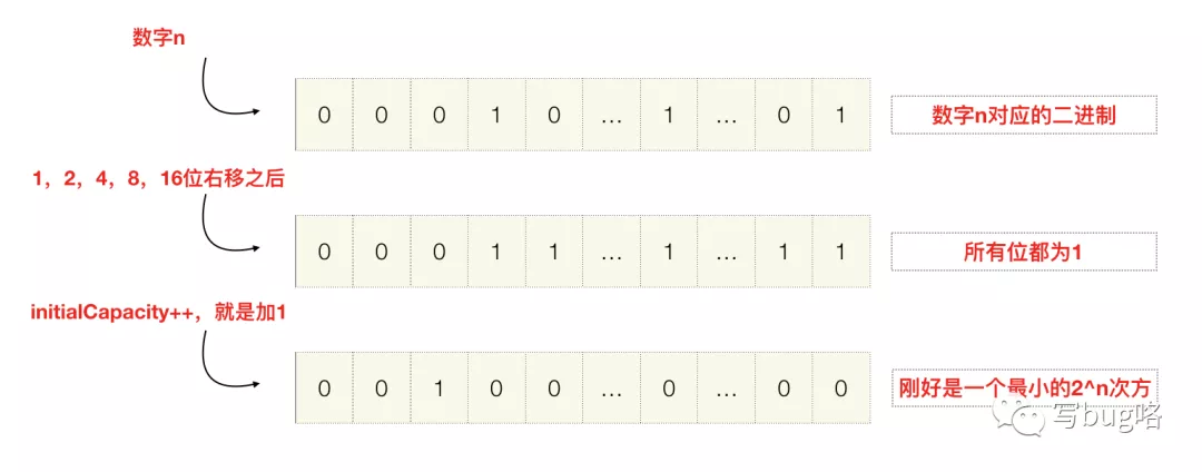b)initialCapacity++的目的:所有为1的变为0,并且进位一个1,比如: