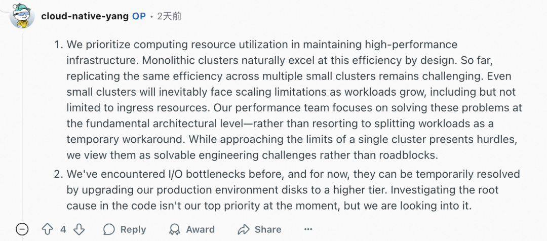 1、在维护高性能基础设施时,我们优先考虑计算资源的利用率。单体集群的设计使其在效率方面自然出众。目前,在多个小型集群之间复制相同的效率仍然具有挑战性。即使是小型集群,随着工作负载(包括但不限于入口资源)的增长,也不可避免地会面临扩展限制。我们的性能团队专注于从根本架构层面解决这些问题,而不是将工作负载拆分作为权宜之计。虽然接近单个集群的极限会带来一些挑战,但我们认为这些挑战是可以解决的工程挑战,而不是阻碍。