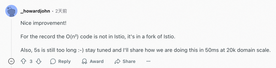 很好的改进! 需要说明的是,O(n²)代码不在 Istio 中,而是在 Istio 的一个分支中。此外,5 秒仍然太长 :-) 请继续关注,我将分享我们如何在 20k 域规模上以 50ms 实现此目的。