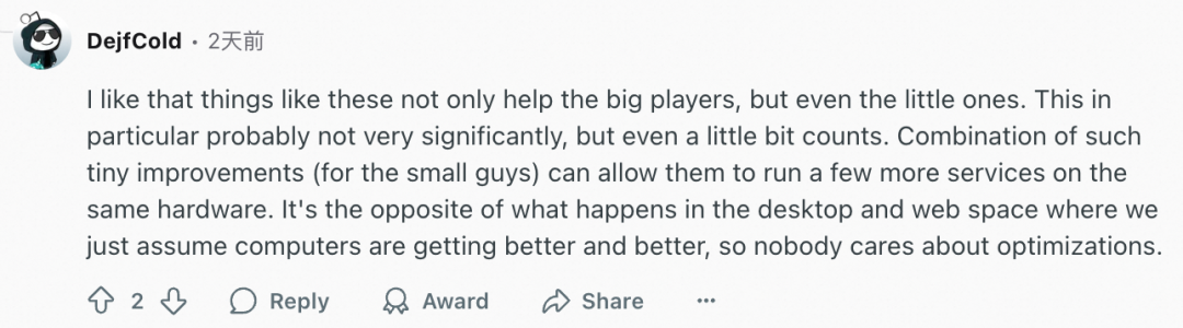 我喜欢这些改进,它们不仅能帮助大公司,也能帮助小公司。虽然这些改进可能并不显著,但哪怕只是一点点,也意义非凡。这些细微的改进(对小公司来说)结合起来,可以让他们在同样的硬件上运行更多服务。这与桌面和网络领域的情况正好相反,在桌面和网络领域,我们总是认为计算机性能越来越好,所以没人关心优化。