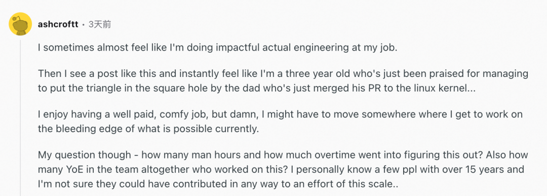 不过,我的问题是——为了解决这个问题,我们投入了多少人力和加班?团队里一共有多少位 YoE 参与了这项工作?我认识几个工作超过 15 年的人,但我不确定他们是否能为如此规模的工作做出任何贡献。