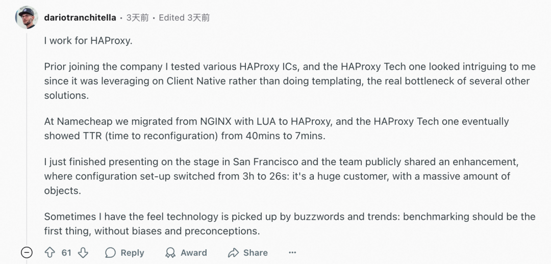 HAProxy 的同学也非常认同任何选型前都应该进行基准测试,而非给予流行语先入为主。