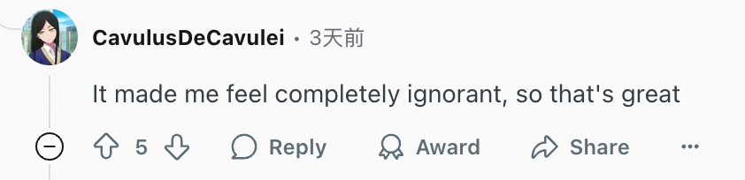 然后我看到这样的帖子,立刻感觉自己就像一个三岁的小孩,刚刚因为成功地将三角形放入方孔中而受到父亲的表扬,而父亲刚刚将他的 PR 合并到 Linux 内核中……