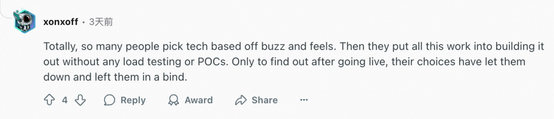 Reddit 有人进行了总结,任何技术的选择,并不改仅基于口碑和感觉,而要在正式构建前,进行充分的选型和 PoC 验证。