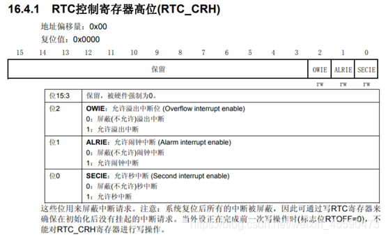 APB1接口设备包括“CR控制寄存器”,这个寄存器是32位的,也就是说CR寄存器分为两个16位寄存器CRL与CRH寄存器,,这两个寄存器的功能为“控制RTC的中断”与“置位RTC的状态标志位”。