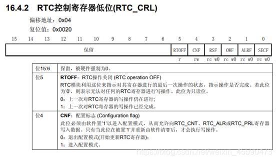 ④ 写保护/取消配置模式 将CNF标志位复位(仅当CNF标志位被清除时,写操作才能进行,这个过程至少需要3个RTC时钟周期);