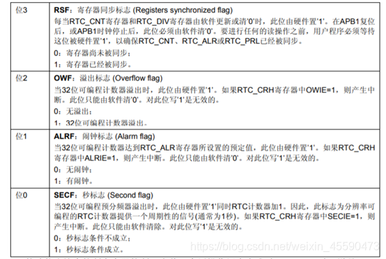 若在读取RTC寄存器时,RTC的APB1接口曾经处于禁止状态,则软件首先必须等待 RTC_CRL寄存器中的RSF位(寄存器同步标志)被硬件置’1’。