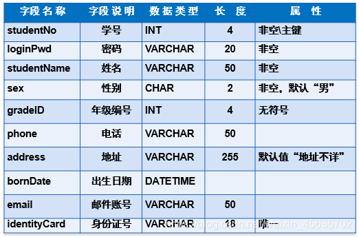 `studentName` varchar(50) not null comment '姓名',
