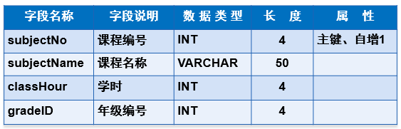 (1)myschool数据库中创建科目表(subject)