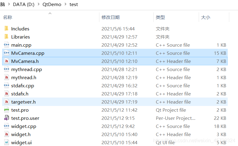环境配置完成后,接着把相机封装好的函数体:cpp文件和头文件复制到项目文件下:MVCamera.cpp和MVCamera.h