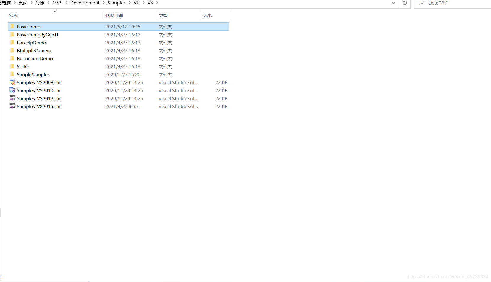 下载后打开下图中的文件,是VS+C++的Demo,本人用到的是第一个demo,打开相机保存图片.
