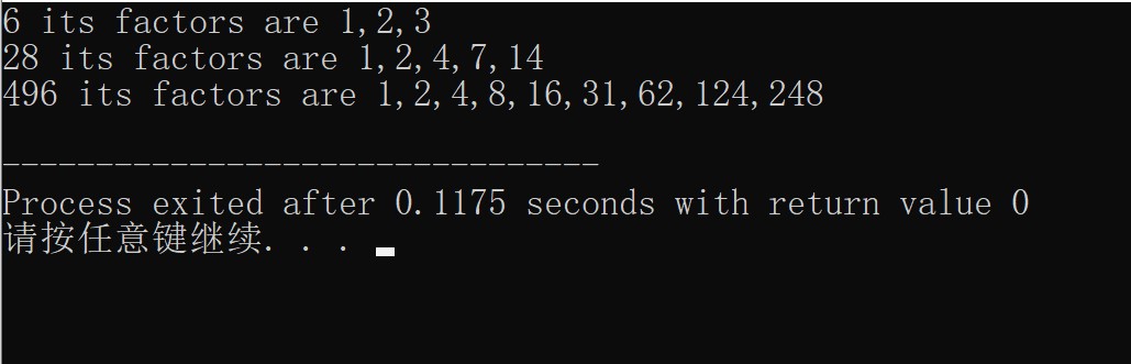完数:一个数如果恰好等于它的因子之和,这个数就称为完数。例如,6的因子为1,2,3,而6=1+2+3,因此6是“完数”。编程序找出1000之内的所有完数,并按下面的格式输出其因子: