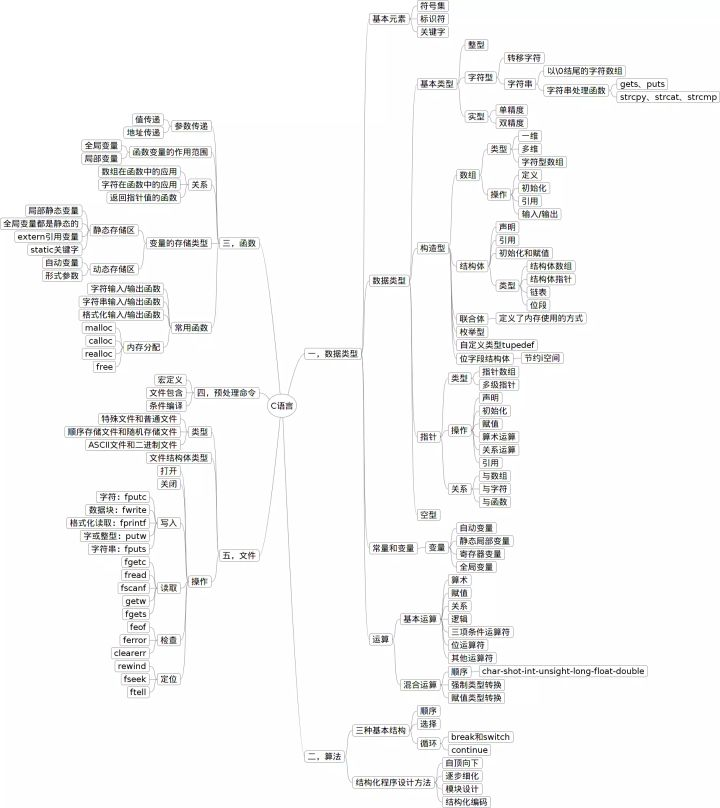 最后,给出了C语言的整个知识体系。在我们学习的过程中,心里要有这么个树形结构才行。