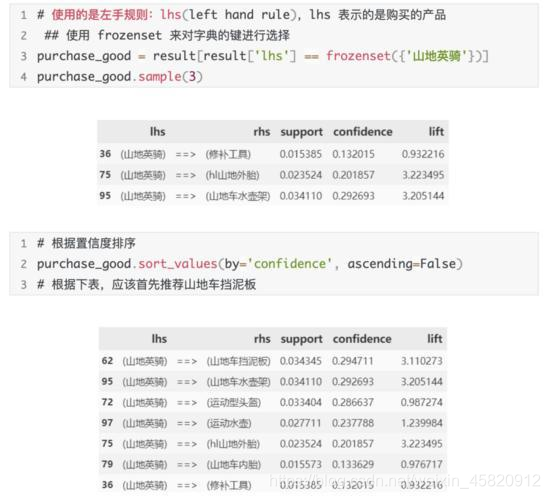 - + confidence : 置信度,购买了 山地车内胎 的前提下,同时购买 ll山地胎 的概率