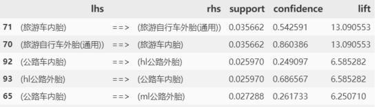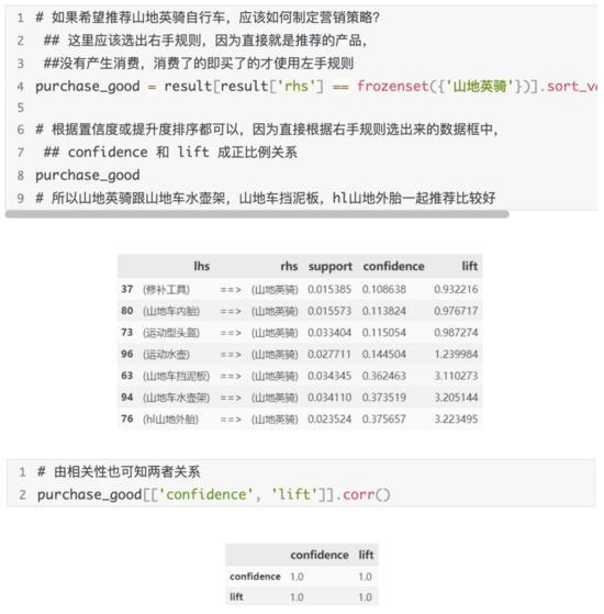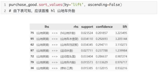 对结果简单分析一些,不要期望每个规则都有意义,要结合业务思考,比如竞速型赛道自行车与运动水壶互斥实属正常,竞速讲究轻量化,还配个水壶干什么... 比如山地车配一个竞速公路车用的运动型头盔...互斥产品则是成对出现的!