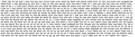 笔者从Metro Lyrics获得了这两首歌的歌词并对其进行了编辑,确保歌词之间没有逗号或多余的空格,还将诸如“You’ve”改为“You have”以保持一致性。之后,笔者将其作为字符串上传到JupyterNotebook上,并为其分配了一个变量(dm&nstr)。