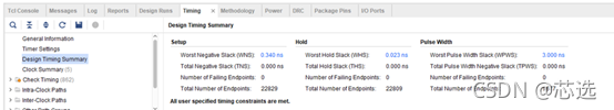 同时,这些用户未发现任何种类的时序违例,所有值均为正值,如“设计时序汇总 (Design Timing Summary)” 中所示。
