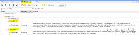 在此示例中,报告中显示了几条警告,这些警告与 CDC 相关的错误实践有关(这些警告的 ID 为 Timing-9 和 Timing-10),如下所示。