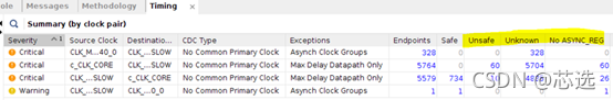 这些警告声称工具经由约束语句(例如,set_false_path 或 set_clock_groups)的使用,在 2 个时钟域之间检测到一个或多个异步时钟域交汇。