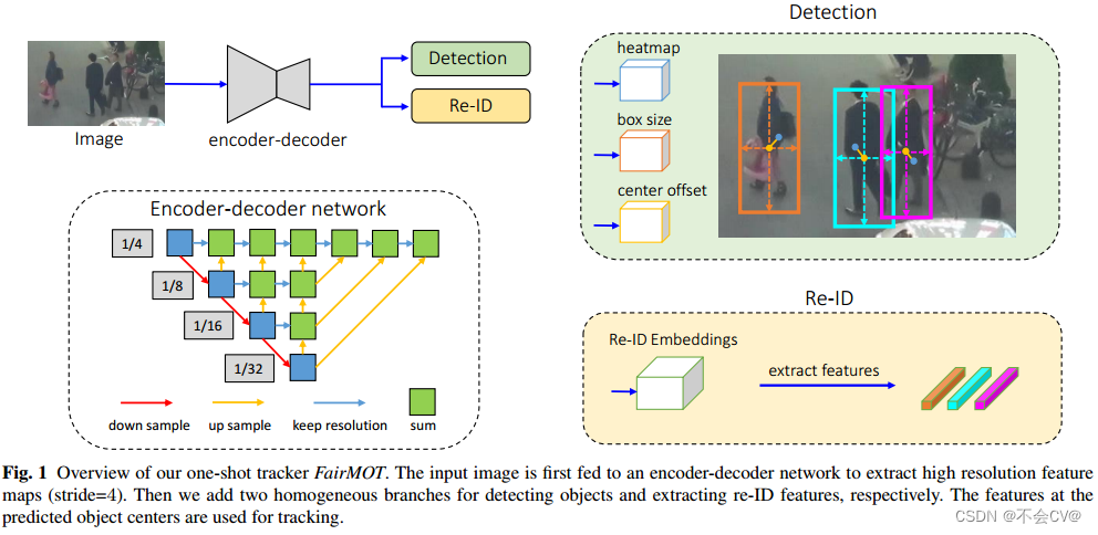 图1 FairMOT概述。首先将输入图像送到编码器-解码器网络以提取高分辨率特征图(stride=4),然后加入两个同构分支分别用于目标检测和Re-ID特征提取,在预测的目标中心的特征被用于跟踪。