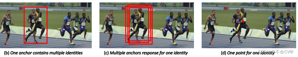 在MOT中,anchor用于检测目标,然后根据检测的结果提取Re-ID特征,但是当检测的结果是错误的时候,这时的Re-ID特征是无效的。而且当两个任务之间发生竞争时,它将有利于检测任务。因为在训练Re-ID特征时,一个anchor可能对应多个身份,多个anchor也可能对应一个身份,尤其是在拥挤的场景中。