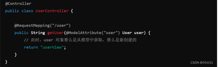 在这个示例中,如果模型中已经有一个 user 属性,它将被绑定到 getUser 方法的参数上。如果模型中没有 user 属性,Spring 会创建一个新的 User 对象,并将其添加到模型中。
