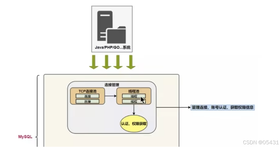 - 一个系统只会和MySQL服务器建立一个连接吗?只能有一个系统和MySQL服务器建立连接吗?当然不是,多个系统都可以和MySQL服务器建立连接,每个系统建立的连接肯定不止一个。所以,为了解决TCF无限创建与TCP频繁创建销毁带来的资源耗尽、性能下降问题。MySQL服务器里有专门的 TCP连接池 限制连接数采用 长连接模式 复用TCP连接,来解决上述问题