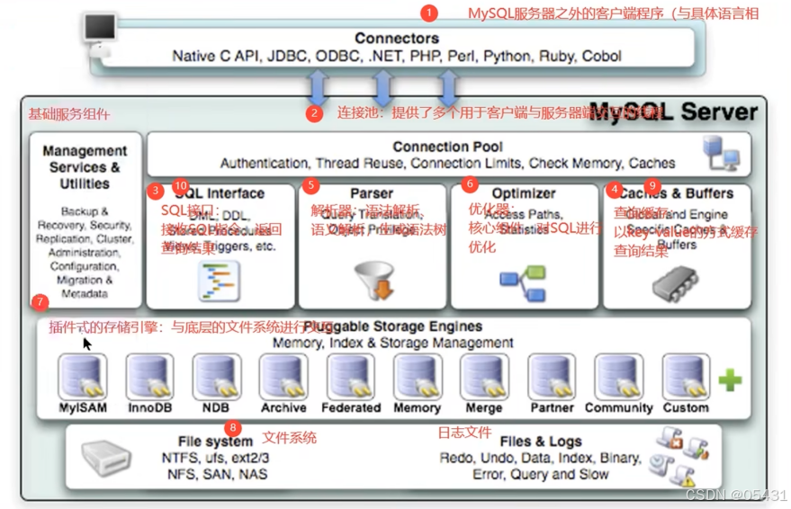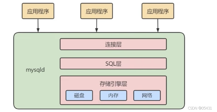 - SQL层(服务层):对SQL语句进行查询处理;与数据库文件的存储方式无关