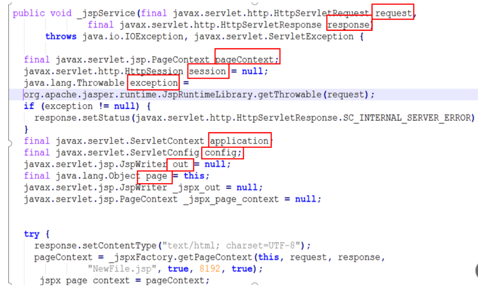 我们顺着代码向下看,会发现_jspService()方法。会发现有九个对象(实际上默认会看到八个),这是后面要讲到的重点。