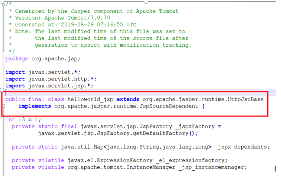 - Jsp本质是一个Servlet ,翻译后的文件结构为:class helloworld_jsp : HttpJspBase : HttpServlet。