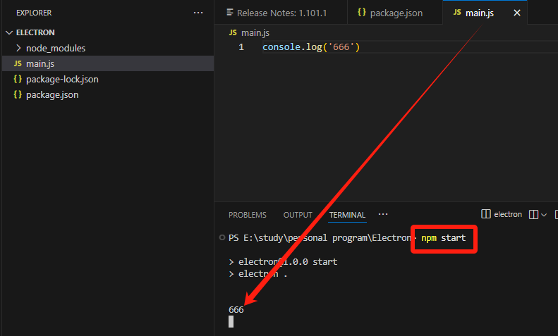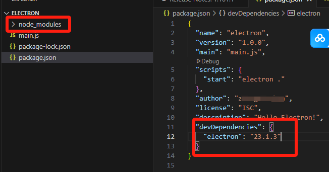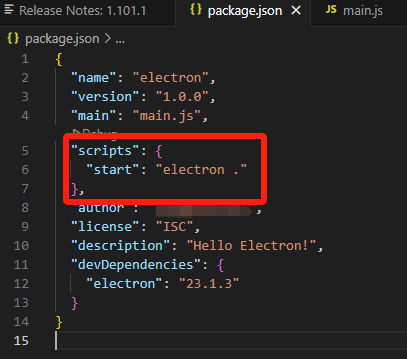 package.json中的"main"值是index.js,这里我按照electron官方文档把入口文件改成main.js,故创建一个与package.json同级的main.js文件,并在其中写入console输出以验证启动是否正常
