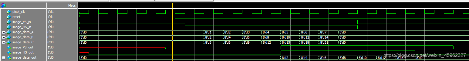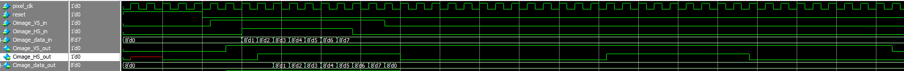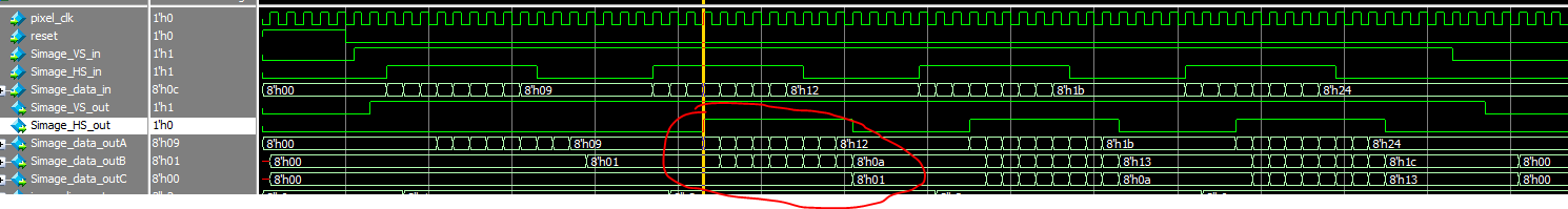 如下图所示,红圈内的数据是输出的第一组3*3模板数据,Cimage_data_outC输出的数据全部为零,前面说过给原图添加的第一行虚拟数据在本模块实现。通过仿真验证了本模块设计是正确的。