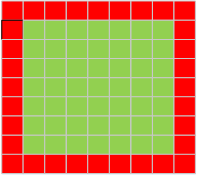 根据图像均滤波算法的原理介绍,我们可以发现一个问题就是一张图像的外围周边的像素是无法进行算法处理,通过算法处理后的图像的分辨率降低了。如下图所以,周边为红色的像素都是无法参与算法运算的,当3*3的模板在整幅图像进行算法处理后,获得的图像的大小就变成了绿色像素的范围了。在实际的图像处理中有两种办法可以解决这个问题: