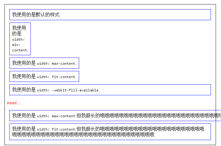 需要提一下的是:max-content 和fit-content, 当元素内容没有超出行宽的时候,最终的宽度都是内容的宽度。而超出行宽的时候,max-content的表现是不换行,出现横向滚动条,fit-content的表现是会换行。