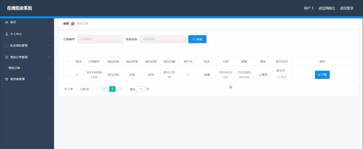 竞拍订单管理,在竞拍订单管理页面可以查看订单编号、商品名称;商品类型、成交价格、发布日期、用户名、姓名、手机、邮箱、地址、是否支付等内容,并可根据需要对竞拍订单管理进行详情,修改,删除或详细内容等操作,如图5-10所示。