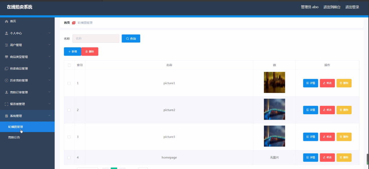 轮播图;该页面为轮播图管理界面。管理员可以在此页面进行首页轮播图的管理,通过新建操作可在轮播图中加入新的图片,还可以对以上传的图片进行修改操作,以及图片的删除操作,如图5-8所示。