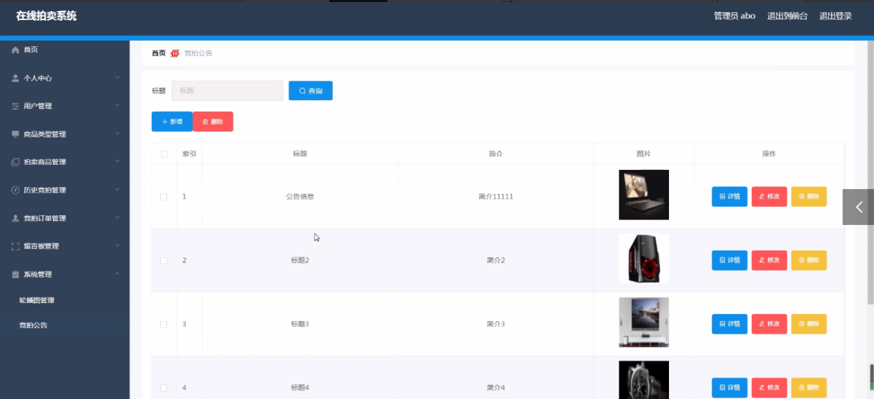 竞拍公告 ,在竞拍公告页面可以查看标题、简介、图片等内容,并可根据需要对竞拍公告进行详情,修改,删除或详细内容等操作,如图5-7所示。