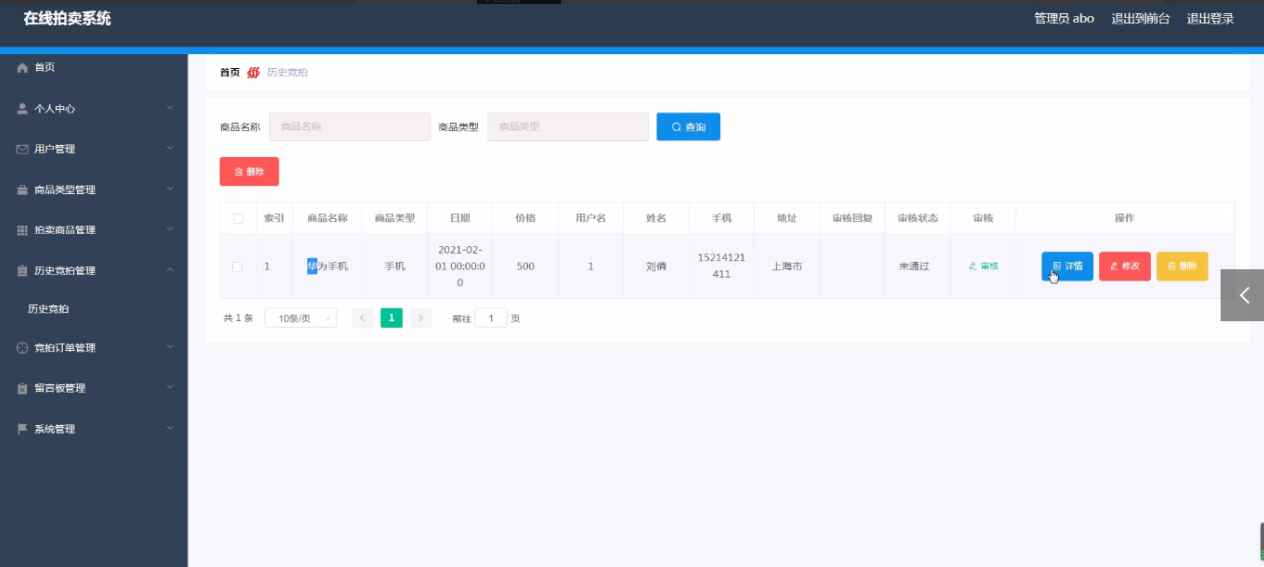 历史竞拍管理,在历史竞拍管理页面可以查看商品名称;商品类型、日期、价格、用户名、姓名、手机、地址、审核回复、审核状态、审核等内容,并可根据需要对历史竞拍管理进行详情,修改,删除或详细内容等操作,如图5-9所示。