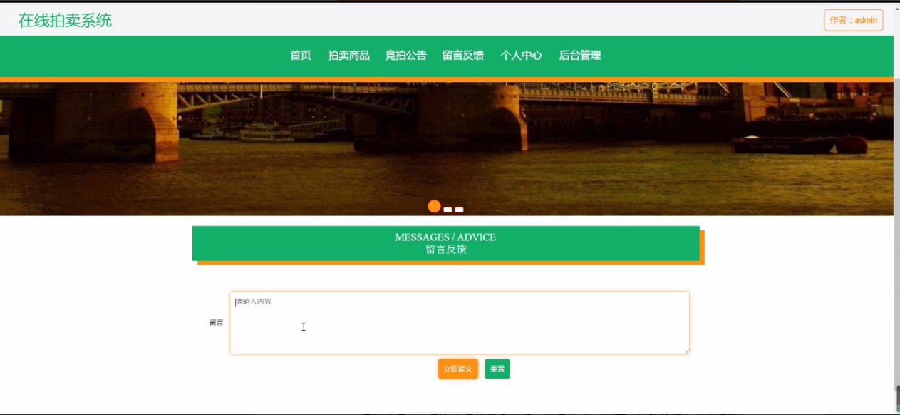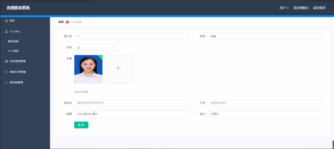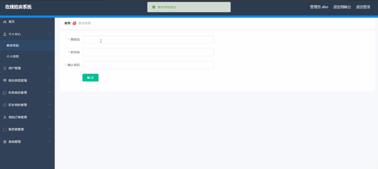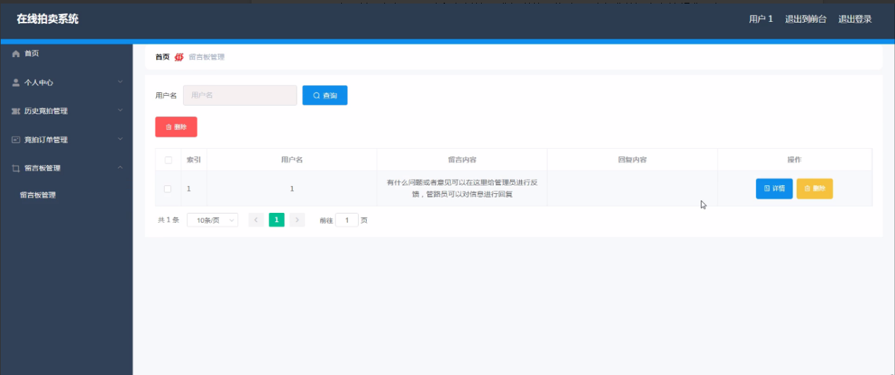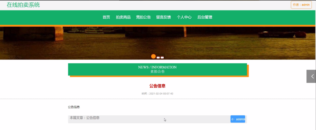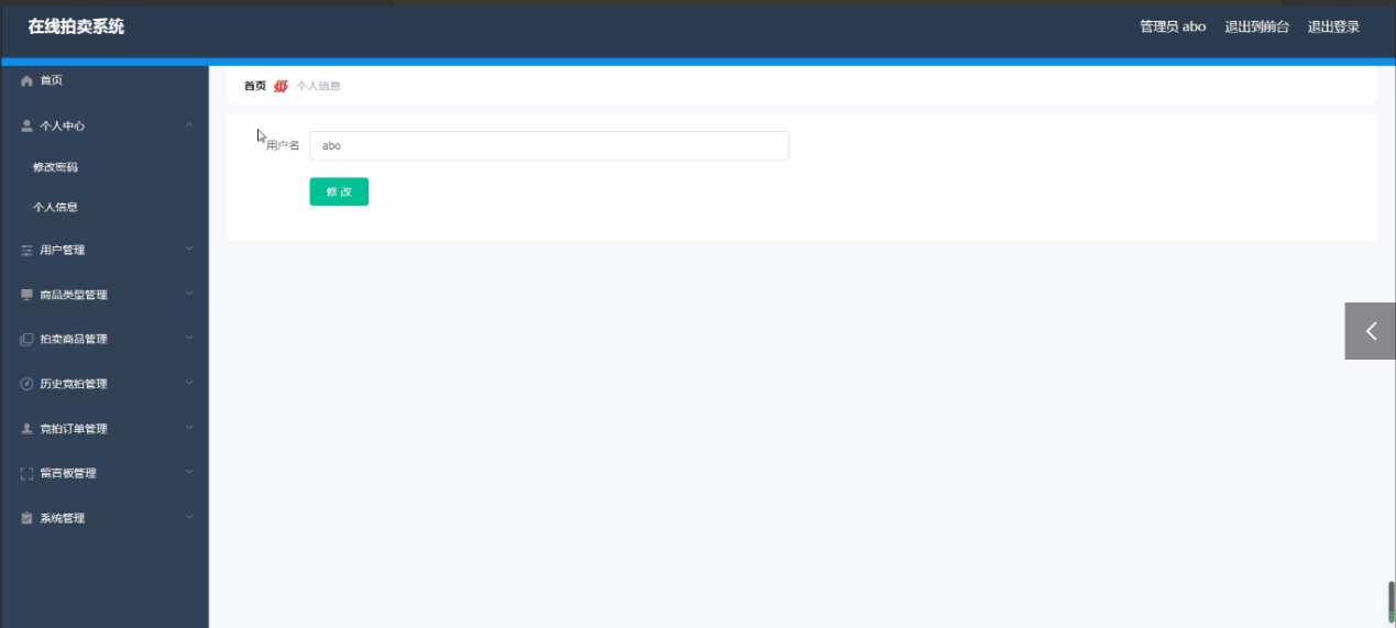 3、功能的完善性:管理员;首页、个人中心、用户管理、商品类型管理、拍卖商品管理、历史竞拍管理、竞拍订单管理、留言板管理、系统管理,用户;首页、个人中心、历史竞拍管理、竞拍订单管理、留言板管理,前台首页;首页、拍卖商品、竞拍公告、留言反馈、个人中心、后台管理模块的修改和维护操作。