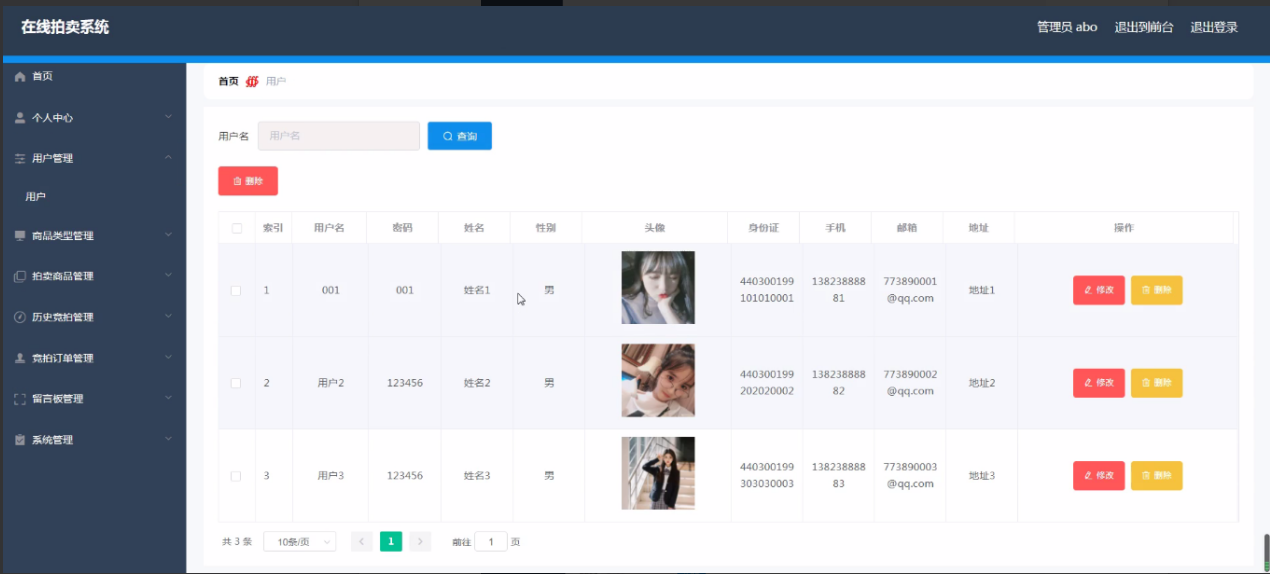 用户管理,在用户管理页面可以填写用户名、密码、姓名、性别、头像、身份证、手机、邮箱、地址等内容,并可根据需要对用户管理进行,修改或删除等操作,如图5-4所示。