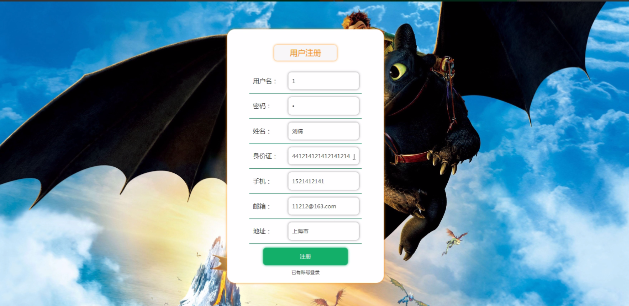 登录、用户注册,在用户注册页面通过填写用户名、密码、姓名、身份证、手机、邮箱、地址等信息进行注册、登录,如图5-17所示。