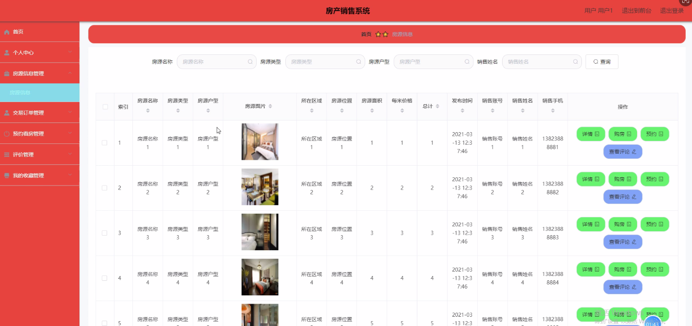房源信息管理:通过列表可以获取房源名称、房源类型、房源户型、房源图片、所在区域、房源位置、房源面积、每米价格、总计、发布时间、销售账号、销售姓名、销售手机等信息,进行详情、购房、预约、查看评论等操作,如图5-2所示。