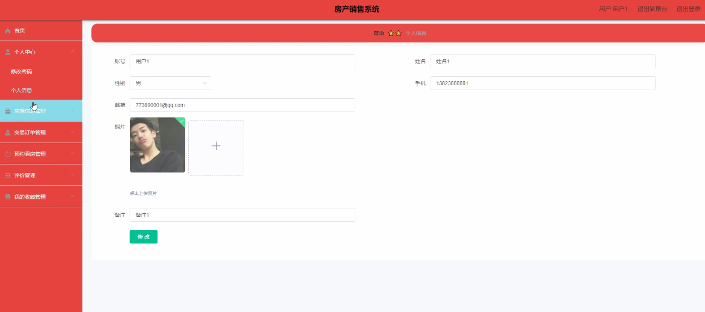 用户点击进入到系统操作界面,可以对首页、个人中心、房源信息管理、交易订单管理、预约看房管理、评价管理、我的收藏管理等功能模块,个人信息:通过列表可以获取账号、姓名、性别、手机、邮箱、照片、备注并进行修改操作,如图5-1所示。