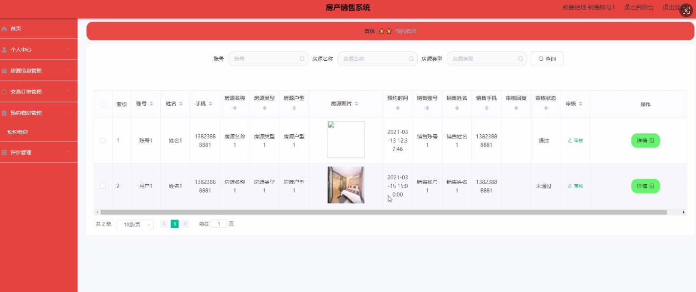 预约看房管理:通过列表可以获取账号、姓名、手机、房源名称、房源类型、房源户型、房源图片、预约时间、销售账号、销售姓名、销售手机、审核回复、审核状态等信息,进行详情、修改、删除操作,如图5-13所示。